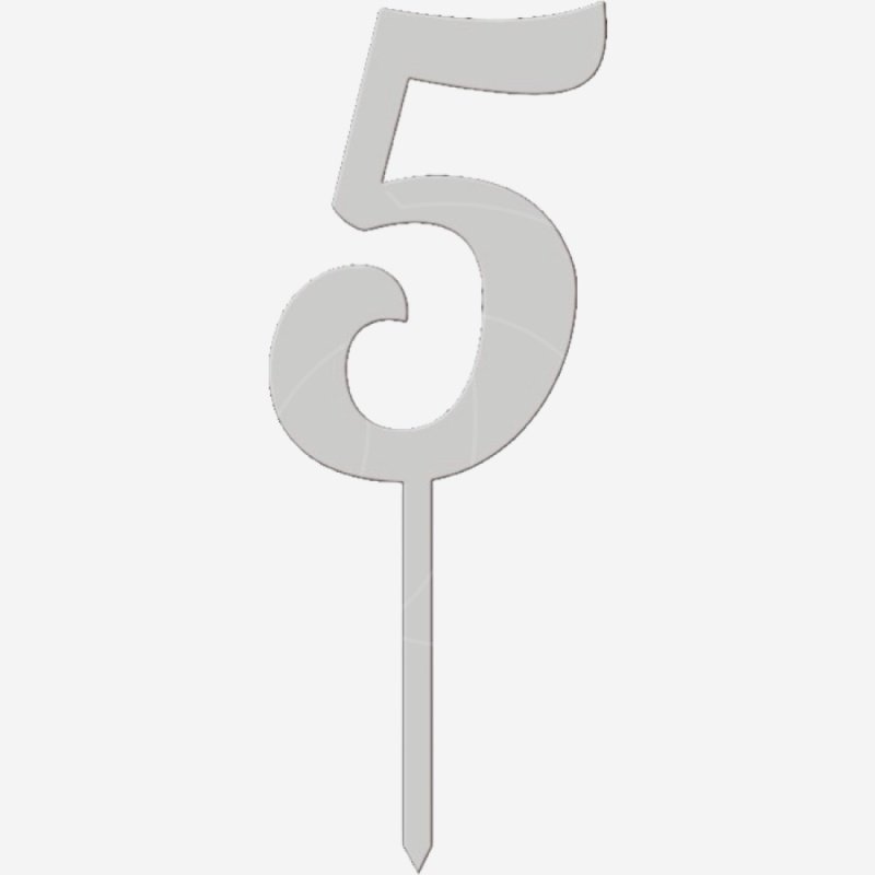 Топпер декоративный акриловый "Цифра 5 на палочке" Серебро 5 см